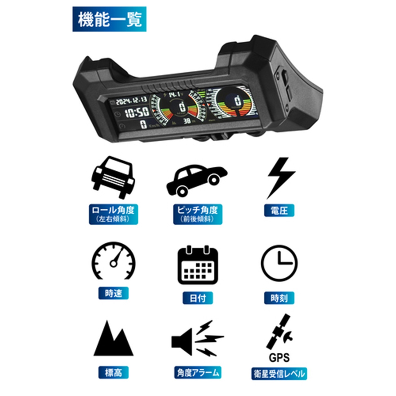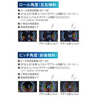 In addition to pitch (front-to-back tilt) and roll (side-to-side tilt), this device displays the date, time, speed, altitude, and voltage. Pitch and roll angles are shown in 5-degree increments.Useful not only for off-road driving but also for everyday use.